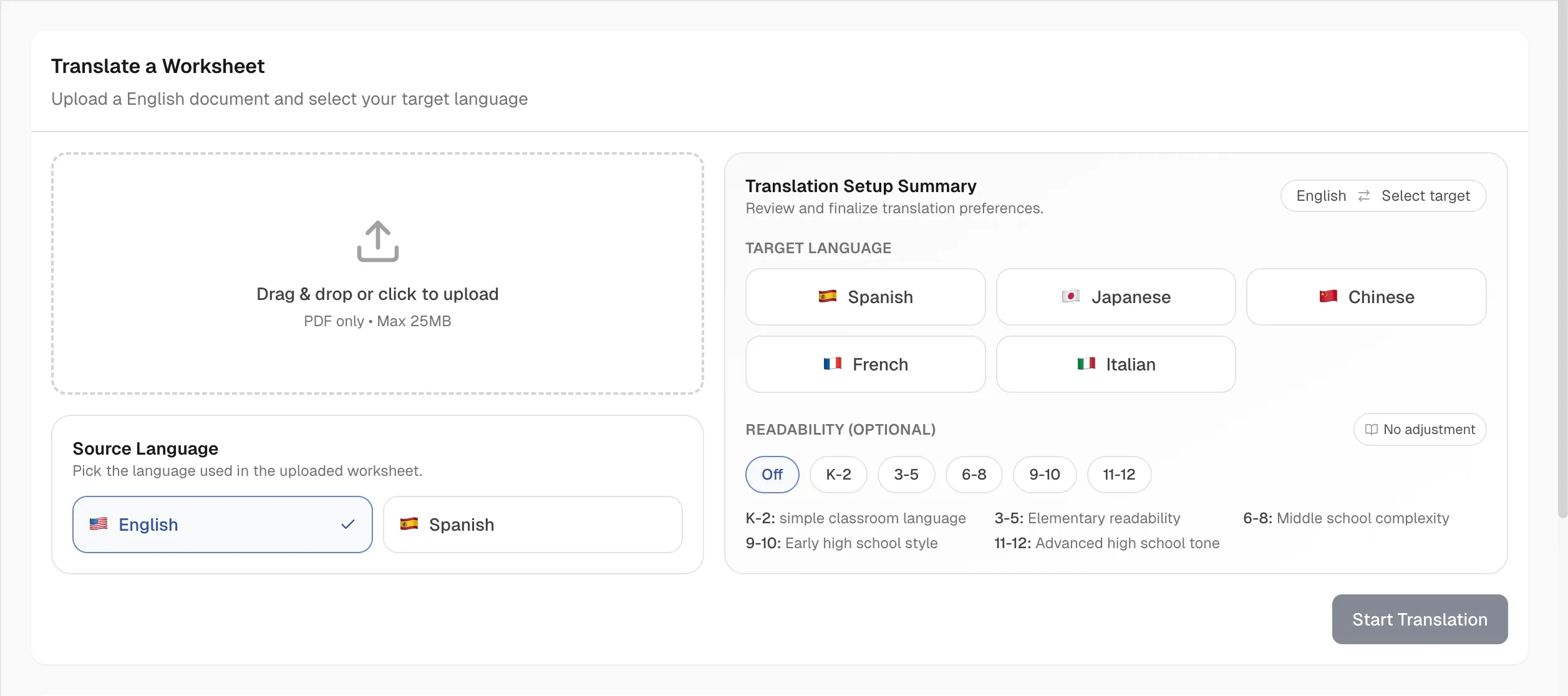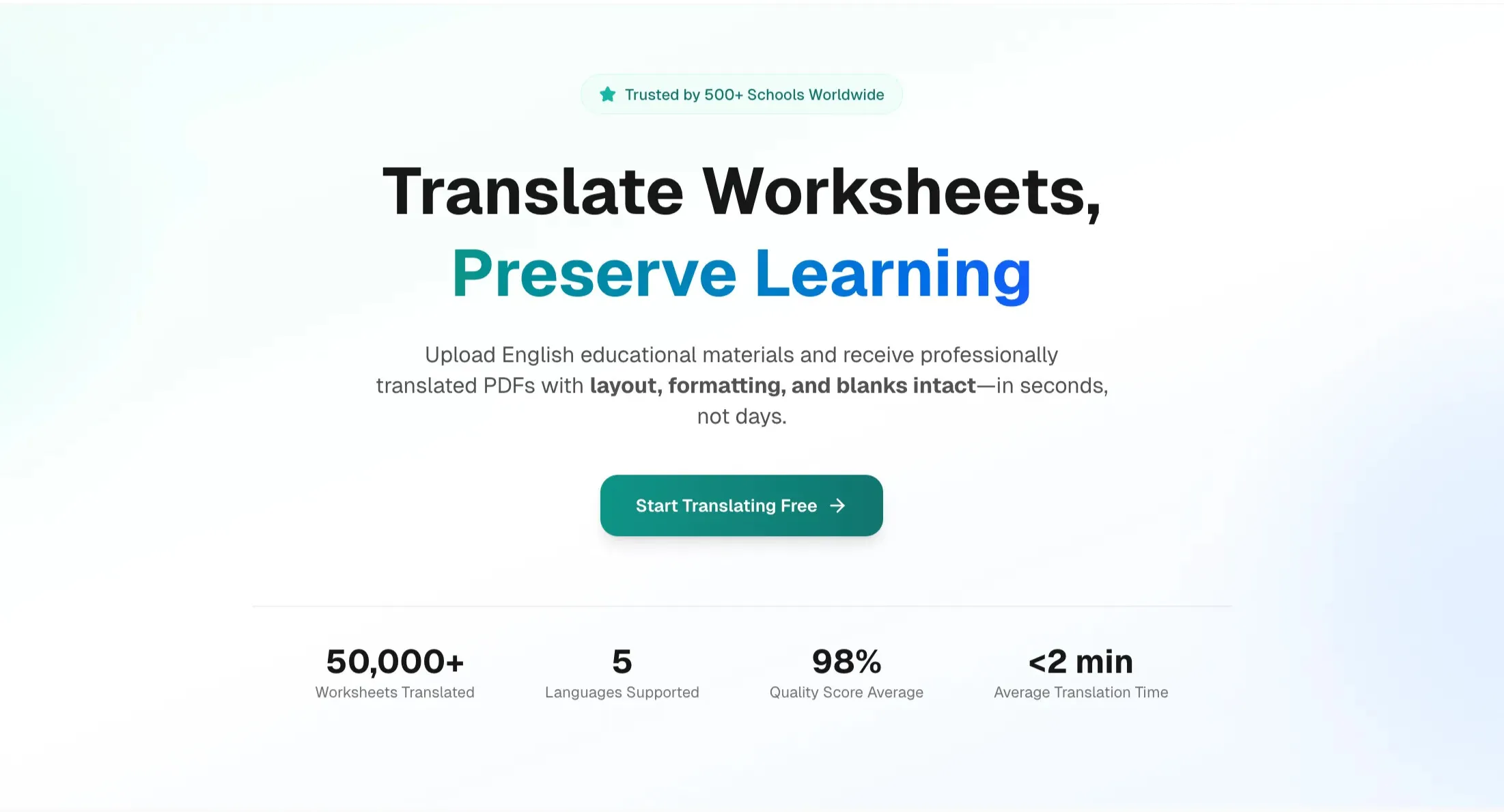 This multi-tenant SaaS platform allows teachers to upload a PDF worksheet and receive a fully translated, layout-preserved version in minutes - no reformatting required. When teachers use tools like Google Translate, they get back plain text. Every table, alignment, fill-in-the-blank, and image is lost. Reconstructing a worksheet manually can take hours. This platform solves that by preserving the original formatting across five supported languages: Spanish, French, Japanese, Simplified Chinese, and Italian.